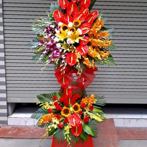 Sự kết hợp cổ điển giữa môn đỏ, lan và hướng dương chưa bao giờ là lỗi thời. Bộ ba này có thể đánh bật mọi chiếc kệ hoa khác chỉ với sự lộng lẫy và uy nghi của mình. Lẵng hoa Khai Trương Hồng Phát KT106 rất thích hợp để trở thành món quà chúc mừng cho mọi sự kiện.